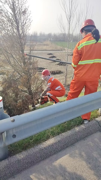 養(yǎng)護(hù)作業(yè)人員身著反光防護(hù)服,佩戴安全帽,分工協(xié)作,清理路面、中央分隔帶、路側(cè)邊坡、橋下空間等重點(diǎn)區(qū)域的垃圾和枯枝雜物,做到“發(fā)現(xiàn)一處、清理一處、規(guī)范一處”;對沿線影響通行安全的枯樹、危樹,養(yǎng)護(hù)人員嚴(yán)格按照作業(yè)規(guī)范,先做好安全警示防護(hù),再利用專業(yè)設(shè)備進(jìn)行砍伐、清理,及時(shí)將枯樹枯枝集中清運(yùn)至指定地點(diǎn)合規(guī)處置,避免二次堆積引發(fā)風(fēng)險(xiǎn),切實(shí)消除道路安全隱患。