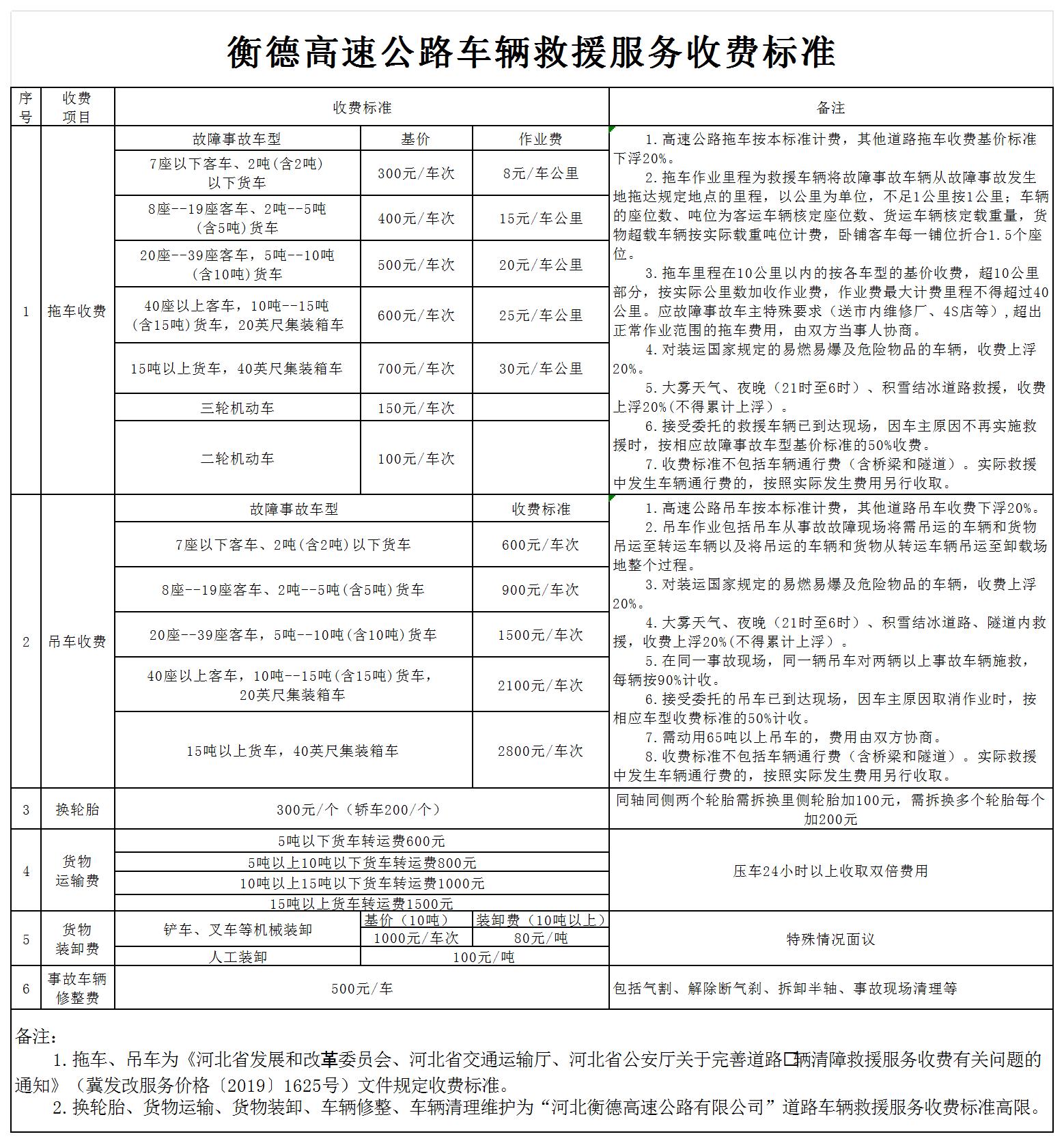衡德高速公路車輛救援服務(wù)收費(fèi)標(biāo)準(zhǔn)